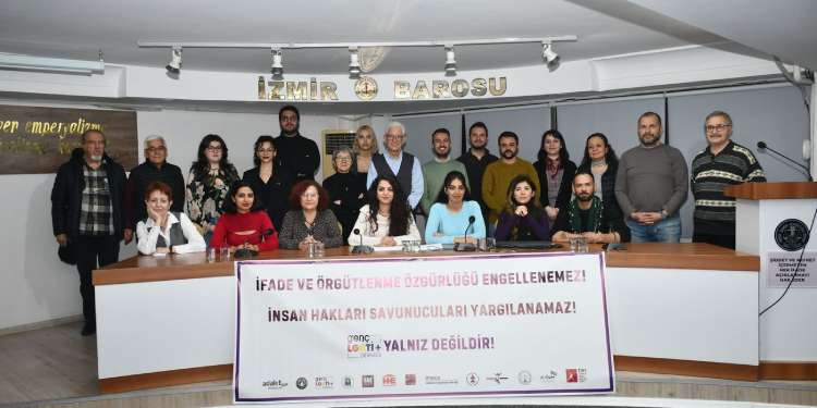 İzmir’de insan hakları örgütleri ve hukuk örgütleri; insan hakları savunucusu 22 kişiye, İstanbul Büyükşehir Belediye Başkanı Ekrem İmamoğlu’nun tutuklanmasına karşı protestolar, Genç LGBT+ Derneği üyelerine “Cumhurbaşkanına hakaret etmekten” açılan davanın 6 ile 8 Nisan’da görülecek duruşmasına ilişkin açıklama yaptı. İzmir Barosu’nda yapılan açıklamada, “ifade ve örgütlenme özgürlüğünü engellenemez. İnsan Hakları savunucuları yargılanamaz. Genç LGBT+ Derneği yalnız değildir” pankartı yer aldı.