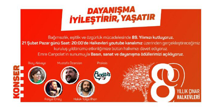 Ödül takdimleri yapılan Eylem Nazlıer, Çağhan Kızıl, Nazlı Yerebatmaz, Erinç Sağkan, Demet Aran, Tamer Arda Erşin, Vecih Cüzdan, Murat Bay, Burcu Karakaş, Gül Gündüz, Özge Erdoğan, Pelin Buzluk, Kaan Can Bircan, Reyhan Karadeli, Nazan Karacabay, Aslı Alpar, Murat Çakır, Yaşar Aydın ve Cargil işçileri de Halkevleri’nin 89’uncu yılını kutlayarak dayanışma mesajlarını dile getirdi.