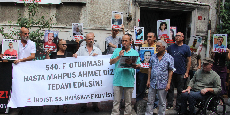 Eylemde, Kandıra Cezaevi’nde üç yıldır mide ve lenf kanseriyle mücadele eden ve tedavi edilmeyen ağır hasta tutuklu Ahmet Dizlek’in durumuna dikkat çekildi. Dizlek için yapılan açıklamanın metnini İHD İstanbul Şubesi Yönetim Kurulu (YK) üyesi Ferit Barut okudu. Barut, cezaevlerinin hastalık üreten bir yer haline geldiğini ve tutuklular için adeta “ölüm evleri” mekanına geldiğini aktardı. Barut, tutukluların cezaevlerinde tedavi edilmediği gibi birçok hak gaspına uğrayarak ölüme terk edildiğini belirtti. Barut, ölüme terk edilen tutuklulardan birinin de tutuklu Ahmet Dizlek olduğunu dile getirdi.