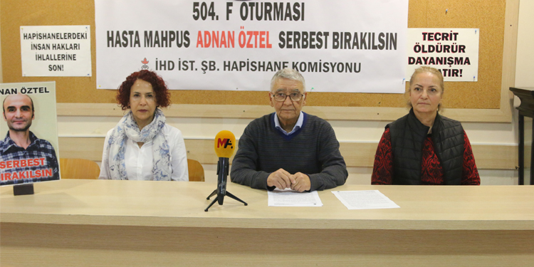 İnsan Hakları Derneği (İHD) İstanbul Şubesi Hapishaneler Komisyonu, hasta tutukluların durumuna dikkat çekmek için her hafta yaptığı “F Oturumu” eyleminin 504’üncüsünü Taksim’de bulunan dernek binasında açıklama yaptı. Komisyon üyeleri bu hafta Tekirdağ 1 Nolu F Tipi Cezaevi’nde bulunan 51 yaşındaki Adnan Öztel’in durumuna dikkat çekti. Açıklamanın yapıldığı salona “Hasta mahpus Adnan Öztel serbest bırakılsın” pankartı asıldı.
