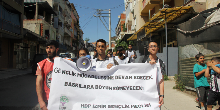 HDP Gençlik Meclisi üyeleri, Bayraklı ilçesi Yamanlar Kültür Sanat Evi önünde bir araya gelerek HDP ilçe binasına yürüyüş yaptı. Yürüşte “Gençlik mücadelesine devam edecek, baskılara boyun eğmeyecek” pankartı açılarak, sık sık, “Bijî berxwedana ciwana, bijî berxwedana HDP”, “Gözaltılar tutuklamalar bizi yıldıramaz”, “Gençlik yürüyor mücadele büyüyor” sloganları atıldı.