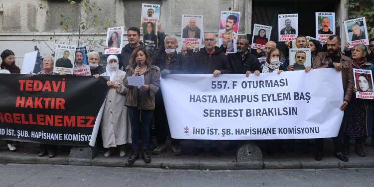 İnsan Hakları Derneği (İHD) İstanbul Şubesi Hapishane Komisyonu, hasta tutukluların durumuna dikkat çektikleri “F Oturması” eyleminin 557’’incisini dernek binası önünde gerçekleştirdi. Bu haftaki eylemde Gebze Kadın Kapalı Cezaevi’nde tutulan hasta tutuklu Eylem Baş’ın sağlık durumuna dikkat çekildi. Tutuklu yakınlarının katıldığı eyleme birçok insan hakları savunucusu da destek verirken eylemde, “Tedavi haktır engellenemez” pankartı taşındı. Eylemciler sık sık “Eylem Baş serbest bırakılsın”, “İnsan haklarıyla insandır”, “Tecrit öldürür, dayanışma yaşatır” sloganları attı.