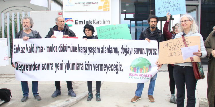 İklim Adaleti Koalisyonu, deprem bölgesindeki enkaz ve molozların su kaynakları ile yaşam alanlarına dökülmesine dair İstanbul Valiliği Çevre, Şehircilik ve İklim Değişikliği İl Müdürlüğü önünde açıklama yaptı. “Enkaz kaldırma, moloz dökümüne karşı yaşam alanları, doğayı savunuyoruz. Depremden sonra yeni yıkımlara izin vermeyeceğiz” pankartını açarak, “Moloz, asbeste dur de”, “Dönüşü mümkün olmayan doğa katliamına dur de”, “Ölümü değil yaşamı savunun” dövizleri taşıyan ekolojistler, “Havama, suyuma toprağıma dokunma”, “Gitmiyoruz buradayız” ve “Eko kırım yasasını yapacağız” sloganları attı.