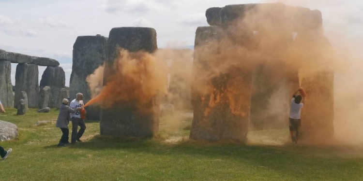İki aktivist, başkent Londra’nın 130 kilometre batısında yer alan Stonehenge anıtına turuncu toz boya püskürttü.