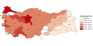 Böylece aşağıdaki haritadan da görülebileceği gibi Kürtlerin ağırlıklı olarak yaşadıkları illerde elde edilen ortalama hane halkı harcanabilir geliri Türkiye ortalamasının ancak yüzde 46,7’si ve İstanbul’dakinin yüzde 34,1’i kadar olabildi.