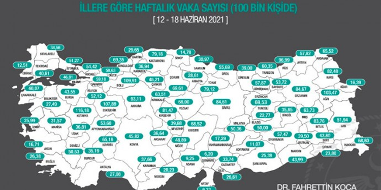 Koca yaptığı paylaşımda, “İllerimizde 100.000 nüfusa karşılık gelen bir haftalık toplam vaka sayısını gösteren insidans haritasının güncel halini ekte görebilirsiniz. Vaka sayılarının düşüş hızı azalsa da normalleşmeye engel değil. Aşı ile bitecek” ifadesini kullandı.