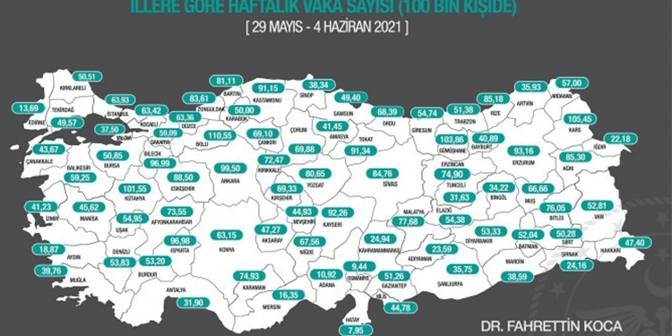 Koca paylaşımında, “İllerimizde 100.000 nüfusa karşılık gelen bir haftalık toplam vaka sayısını gösteren insidans haritasının güncel halini ekte görebilirsiniz. Vaka sayılarının düşüş hızı azalsa da düşme eğilimi devam ediyor. Son bir haftada vaka sayısı en çok azalan illerimiz Gümüşhane, Bilecik, Bayburt, Kocaeli ve Kırklareli. Vaka sayılarında düşüş devam edecek aşı ile bağışıklık kazanacağız. Bu güce güvenin” ifadelerini kullandı.