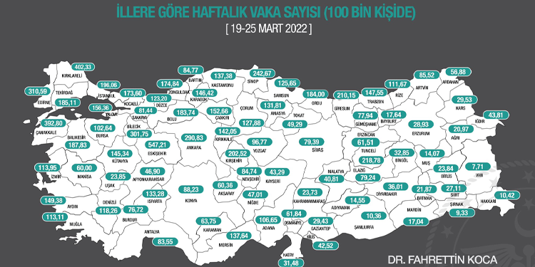 Sağlık Bakanlığı verilerine göre, 19-25 Mart haftasında 100 binde Kovid-19 vaka sayısı İstanbul’da 196.06, Ankara’da 290.83, İzmir’de ise 113.95 oldu. Bir önceki hafta sırasıyla 239, 395 ve 247 vaka kayda geçmişti.