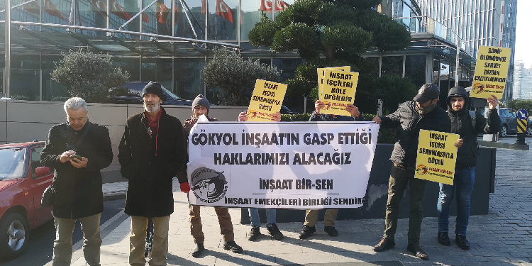 İnşaat Emekçileri Birliği Sendikası’nda (İnşaat Bir-Sen) örgütlü olan yaklaşık 30 işçi, Büyükçekmece’de yaptıkları okul inşaatını usule uygun yapmadıkları gerekçesiyle Gökyol İnşaat firmasının taşeronu olan MYR firması tarafından 25 Aralık’ta işten çıkarıldı. Çıkarılan işçilere maaşlarını vermeyen firma ile sendika arasındaki müzakereler sonucunda işçi Kamil Doğan hariç herkese maaşları verildi. Maaşını alamayan Doğan ve İnşaat Bir-Sen üyeleri Maslak’ta bulunan Gökyol firması önünde eylem gerçekleştirdi. “Gökyol İnşaat’ın gasp ettiği gasp ettiği haklarımızı alacağız” pankartının açıldığı eylemde, “İnşaat işçisi sendikasıyla güçlüdür”, “İnşaat işçileri köle değildir” , “Sahip olduğunuz servet bizden çaldıklarınızdır” dövizleri açıldı. Birleşik Mücadele Platformu’nun destek verdiği eylemde, “İşçiyiz haklıyız kazanacağız” , “Yaşasın işçilerin mücadele birliği” , “İşçiye uzanan elleri kıracağız” sloganları atıldı.