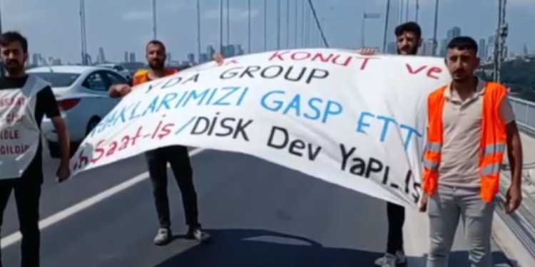 İstanbul’un Ataşehir ilçesinde YDA Group bağlı Finans Merkezi Şantiyesi’nde gasp edilen haklarını geri almak için 6 gündür eylem yapan inşaat işçileri, eylemlerini Boğaziçi (15 Temmuz) Köprüsü’nde sürdürdü. İşçiler, “Emlak Konut ve YDA Group haklarımızı gasp etti” pankartını taşıyarak, “Direne direne kazanacağız” sloganlarıyla köprüyü trafiğe kapattı.