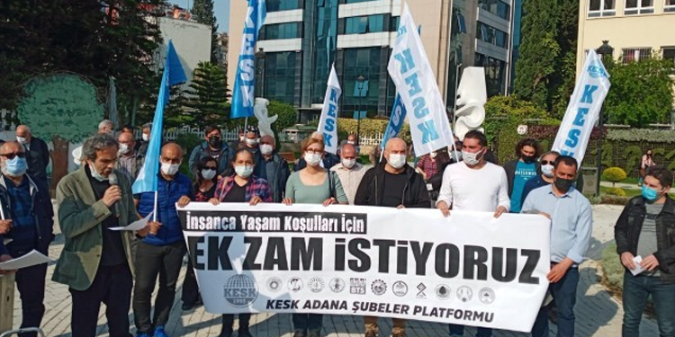 Kamu Emekçileri Sendikaları Konfederasyonu (KESK) Adana Şubeler Platformu, ek zam talebiyle Heykelli Parkı’nda basın açıklaması gerçekleştirdi. “İnsanca yaşam koşulları için ek zam istiyoruz” pankartının taşındığı açıklamaya KESK’e bağlı sendika temsilcilerinin yanı sıra EMEP, Halkların Demokratik Partisi (HDP) ve çok sayıda kişi katıldı.
