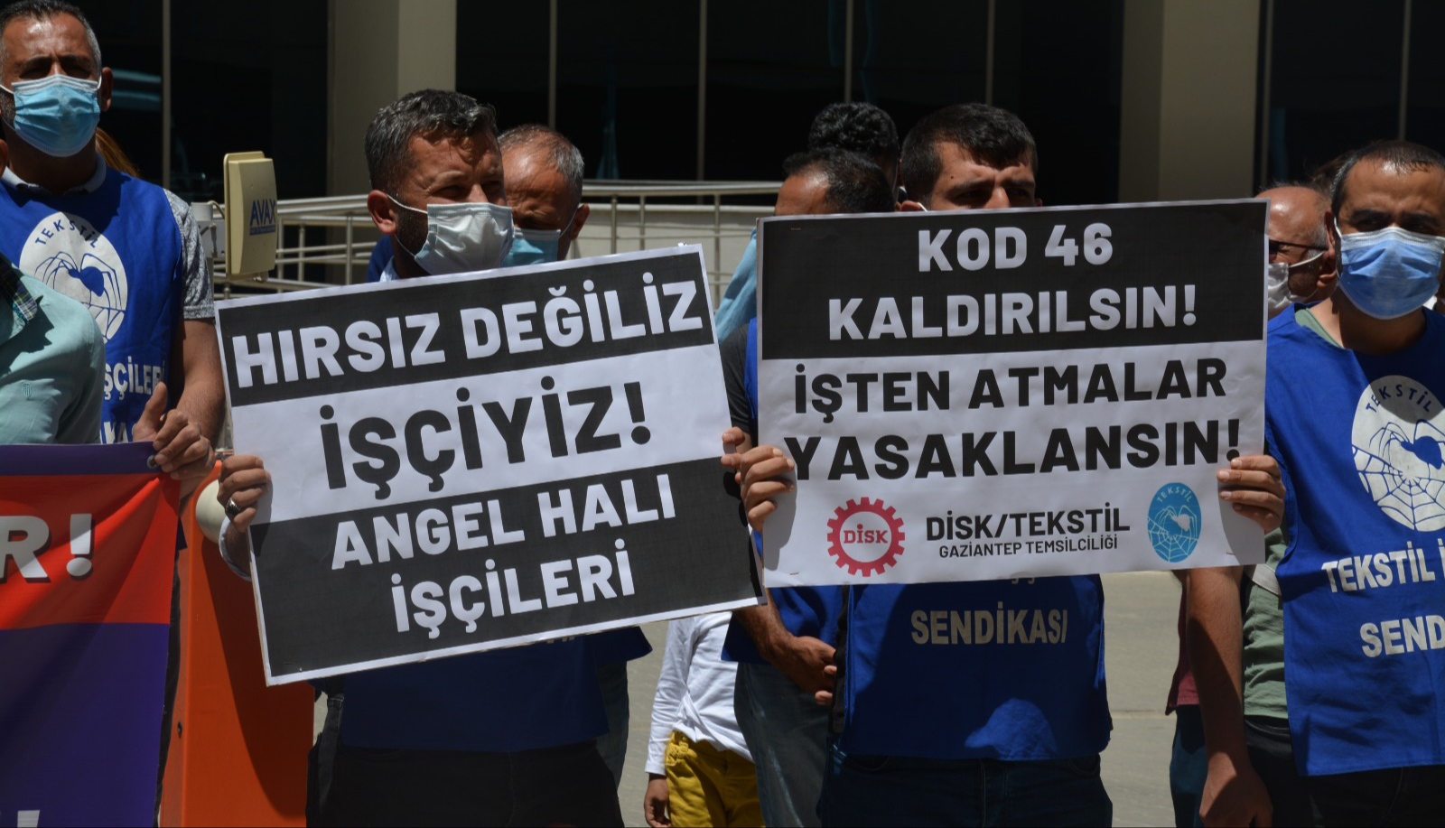Antep Başpınar Organize Sanayi Bölgesi’nde (OSB) faaliyet yürüten Angel Halı Fabrikası’nda Kod 46 (hırsızlık) gerekçesi ile işten çıkarılan 63 işçi Antep İl Sosyal Güvenlik Kurumu önünde açıklama yaptı. Çok sayıda işçinin yanı sıra açıklamaya, Devrimci İşçi Sendikaları Konfederasyonu (DİSK) Tekstil İşçileri Sendikası Antep Bölge Temsilcisi Mehmet Türkmen de katıldı. Açıklamada, “Kod 29, Kod 46 işçi düşmanı tüm kodlar kaldırılsın” pankartı ve “Hırsız değil işçiyiz”, “Kod 46 kaldırılsın işten atmalar yasaklansın” ve “Kod 29 zulmü yeni kodlarla devam ediyor” dövizleri taşındı.