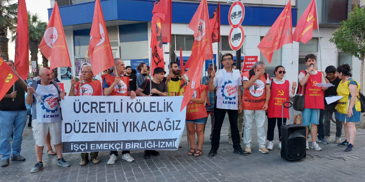 Asgari ücrete yapılan zammın cebe girmeden eridiğini vurgulayan İşçi Emekçi Birliği İzmir üyeleri, işçileri bu düzene karşı örgütlenmeye çağırdı.