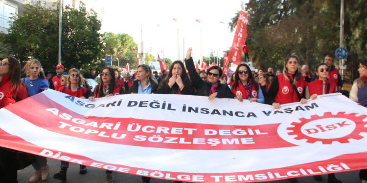Devrimci İşçi Sendikaları Konfederasyonu (DİSK) Ege Bölge Temsilciliği, “Gelirde adalet, vergide adalet ve insanca yaşanacak bir ücret” talebiyle Basmane Meydanı’ndan Cumhuriyet Meydanı’na yürüyüş düzenledi. Yürüyüş sonrası kitlesel açıklama yapıldı. Siyasi parti temsilcileri ve demokratik kitle örgütleri temsilcileri de yürüyüşe katıldı. Yürüyüşte, “Asgari değil, insanca yaşanacak bir ücret istiyoruz” pankartı açıldı ve sık sık, “Saraya değil emekçiye bütçe”, “Hükümet istifa” ve “Savaşa değil emekçiye bütçe” sloganları atıldı.