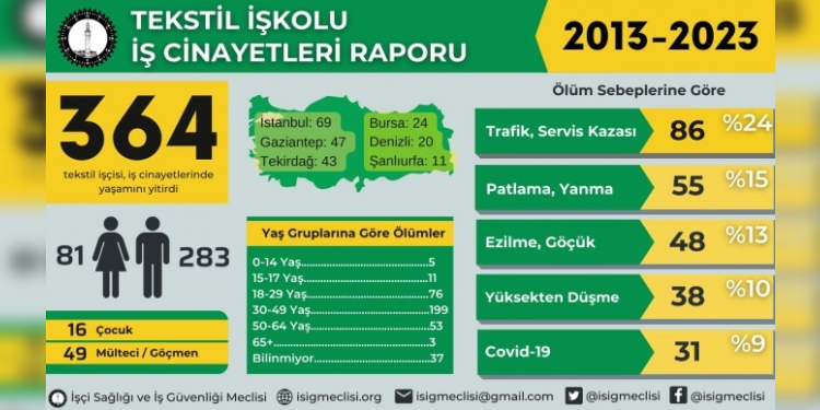 İşçi Sağlı ve İş Güvenliği Meclisi (İSİG), 2013-2023 Tekstil İş Kolu Cinayetleri Raporu’nu açıkladı. Rapora göre, bu sürede 364 tekstil işçisi iş cinayetlerinde yaşamını yitirdi.