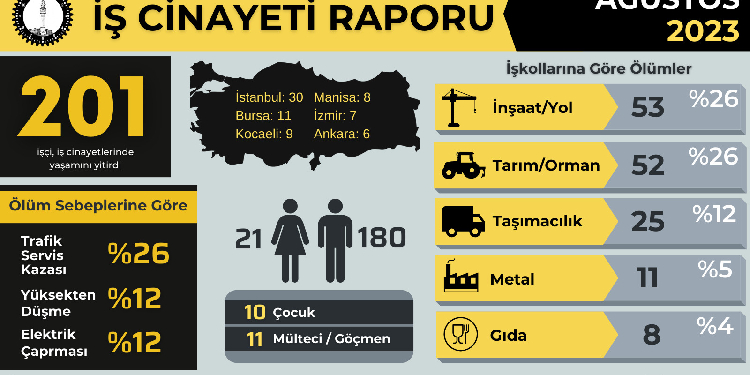 İSİG Meclisinin yayınladığı rapora göre Ağustos ayında en az 201 işçi hayatını kaybetti. Raporda “Yoksullaştırma ve iş cinayetleri kıskacında olan biz işçiler için direnmekten başka çare yok.” denildi.
