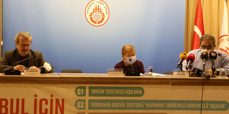 İstanbul Tabip Odası, kentte koronavirüs (Kovid-19) salgınının geldiği durumu ve İstanbul için alınması gereken acil tedbirleri kamuoyuna duyurmak amacıyla Cağaloğlu’nda bulunan binalarında açıklama yaptı. Toplantının yapıldığı salona “İstanbul için 5 acil tedbir” pankartı asıldı.