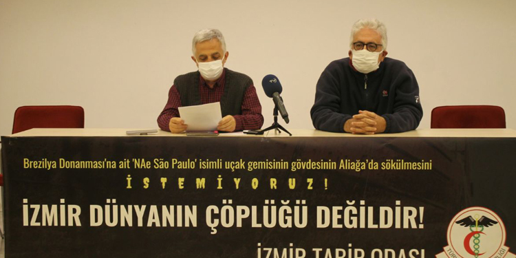 İzmir Tabip Odası, Brezilya’ya ait uçak gemisinin gövdesinin Aliağa’da sökülmesine ilişkin “İzmir dünyanın çöplüğü değildir” sloganıyla Alsancak’ta bulunan İzmir Tabip Odası Konferans Salonu’nda açıklama yaptı. Aliağa ilçesinde bulunan Nemrut körfezinde yaklaşık 380 bin m² arazi üzerinde kurulu 22 adet gemi söküm tesisi olduğunu hatırlatan İzmir Tabip Odası Başkanı Lütfü Çamlı, bu tesislerde özellikle 2010 yılından sonra yıldan yıla artan miktarlarda dünyanın her tarafından getirilen hurda gemilerin söküldüğünü belirtti. Çamlı, “Bu artan gemi söküm trafiği Aliağa ve İzmir için büyük bir çevre kirliliği kaynağı oluşturmakta, bu tesislerin çevresinde yaşayanlar ve çalışan işçilerin sağlığı için büyük bir tehdit oluşturmaktadır” dedi.