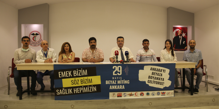 İzmir Sağlık Platformu, sağlık emekçilerinin 29 Mayıs’ta Ankara’da yapacağı miting öncesi İzmir Tabip Odası’nda basın toplantısı düzenledi. “Emek bizim, söz bizim, sağlık hepimizin, Ankara’yı beyaza boyamaya gidiyoruz” pankartı toplantının yapıldığı salona asıldı. Açıklamaya sağlık örgütlerinin temsilcileri katıldı.