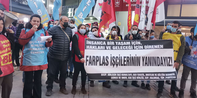 İzmir’de siyasi parti ve emek örgütleri, Kocaeli Gebze Otomotiv Tedarik Sanayi İhtisas Organize Sanayi Bölgesi’nde (TOSB) bulunan Farplas Otomotiv Fabrikası’nda düşük ücretlere karşı iş bırakan ve birçoğunun işten atıldığı işçiler için Konak Alsancak’ta bulunan Türkan Saylan Kültür Merkezi önünde basın açıklaması yaptı. “İnsanca bir yaşam için, hakları ve geleceği için direnen Farplas işçilerinin yanındayız” pankartı açılırken, “İşgal, grev, direniş” , İşçilerin birliği sermayeyi yenecek” sloganları atıldı. Açıklamayı Sonay Tezcan okudu.