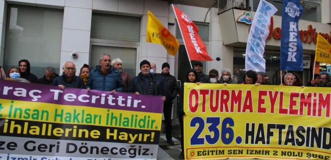 Eğitim ve Bilim Emekçileri Sendikası (Eğitim Sen) 2 Nolu İzmir Şubesi, Kanun Hükmünde Kararname (KHK) ile ihraç edilen kamu emekçilerinin işlerine geri dönmesi için yaptığı oturma eylemi 236’ıncı haftasında sürdü. Karşıyaka İskele karşısında bir araya gelen KHK’lılar, “İhraç tecrittir. Tecrit insan hakları ihlalidir. Hak ihlallerine hayır. İşimize geri döneceğiz” yazılı pankart taşırken sık sık, “Savaşa hayır barış hemen şimdi”,”Direne direne kazanacağız”,”Şebnem hoca aramızda sloganları atıldı. Basın açıklamasına sivil toplum örgütleri siyasi parti temsilcileri katılırken. Bu hafta Barış akademisyenlerinin KHK ile işten çıkarılmalarının 7’inci yıl dönümüne ilişkin yapılan açıklamayı İzmir Dayanışma Akademisi (İDA) üyesi Zeriin Kurtoğlu okudu.