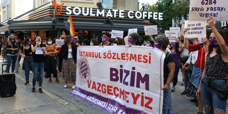 İstanbul Sözleşmesi’nden Vazgeçmiyoruz İzmir Kampanya Grubu’nun, sözleşmenin feshedilmesinin ardından başlattıkları nöbet eylemi 6. haftasında Konak ilçesine bağlı Alsancak’ta bulunan Türkan Saylan Kültür Merkezi önünde devam etti. “İstanbul Sözleşmesi bizim vazgeçmiyoruz” pankartının açıldığı eylemde kadınlar sık sık “İstanbul Sözleşmesi Bizimdir, Vazgeçmiyoruz”, “Kadın cinayetleri politiktir“, “Musa Orhan tecavüzcüdür”, “Erkek-devlet şiddetine son” ve “Kadınlara değil mafyaya barikat” sloganları attı.