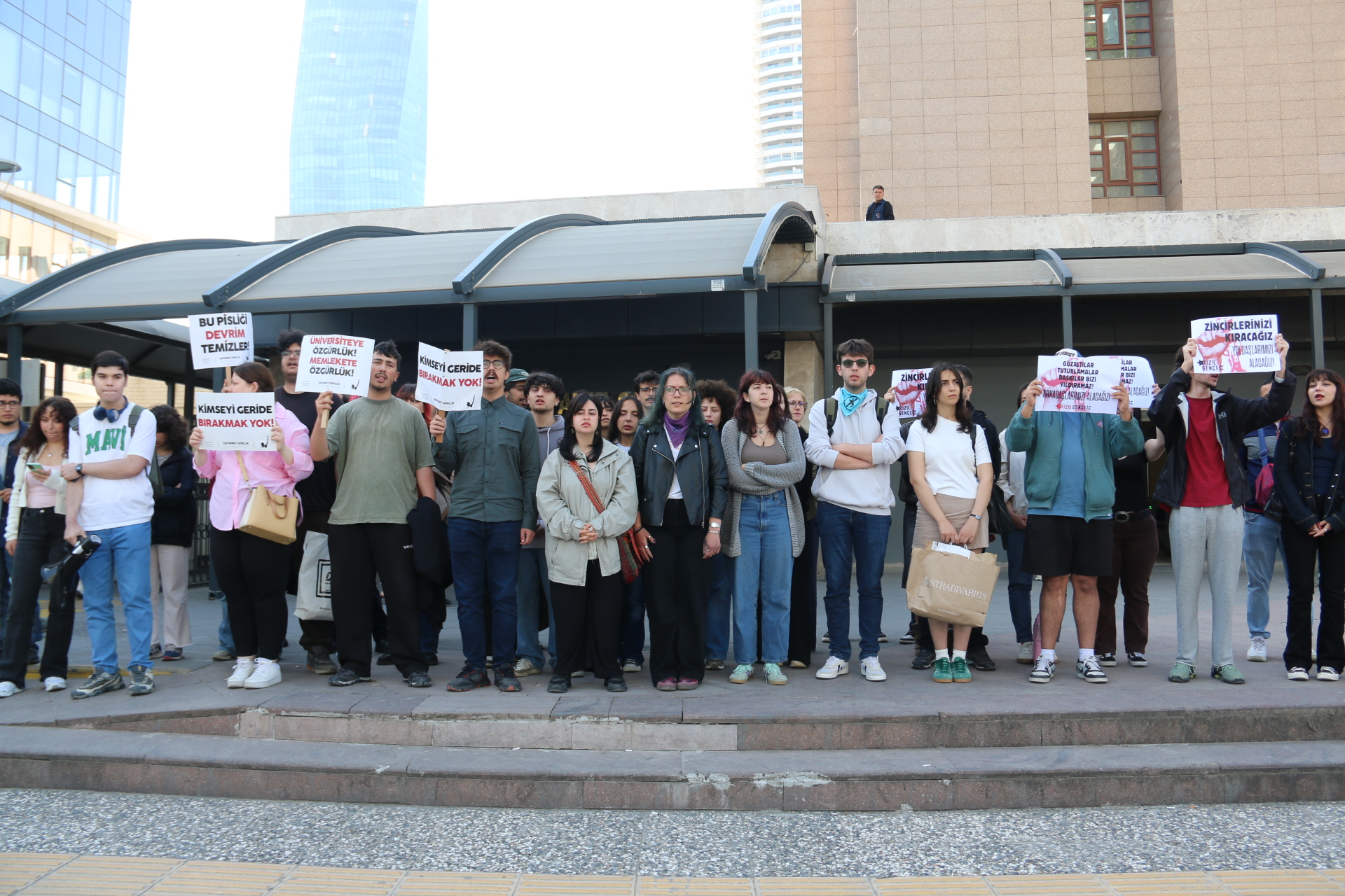 Emine Kırkalı, “Dokuz Eylül Üniversitesi’nde mücadele eden arkadaşlarımız 1 Mayıs’a günler kala sabah saatlerinde yapılan ev baskınlarıyla gözaltına alındı. Bu operasyonlar tesadüf değil; bilinçli bir sindirme ve gözdağı politikasıdır. Hedef alınan yalnızca birkaç öğrenci değil, sorgulayan, itiraz eden, eşit ve özgür bir gelecek isteyen gençliğin ta kendisidir. Arkadaşlarımız, kampüslerde örgütlenen faşist çetelere karşı durdukları, üniversiteleri karanlığa teslim etmedikleri, düşüncelerini örgütlü bir şekilde ifade ettikleri ve geleceklerine sahip çıktıkları için hedef alınmaktadır” diye belirtti.