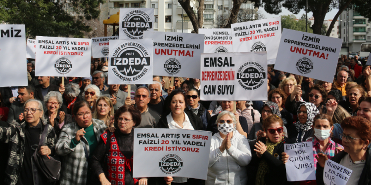 İzmirli depremzedeler, depremin üzerinden geçen sürede kendilerine verilen sözlerin tutulmamasına tepki göstererek, faizsiz deprem kredisi talep etti.