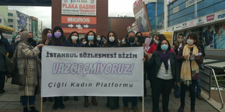 İzmir’in Çiğli ilçesinde de kadınlar sokaklara inerek, İstanbul Sözleşmesi’nden çekilmesini protesto etti. Çiğli Kadın Platformu çağrısıyla Çiğli Belediyesi önünde biraya gelen kadınlar, “Karar geri çekilsin, İstanbul Sözleşmesi Uygulansın”, “Adamlardan bıktık, tek adama tahammülümüz yok”, “Kısa Çalışma ödeneği, ücretsiz izin, Kod29, Şimdi de İstanbul Sözleşmesi” dövizlerini taşıdı. İstanbul Sözleşmesi’nin feshedilmesine de kadınlar , “İstanbul sözleşmesi yaşatır vazgeçmiyoruz”, “Katledilen kadınlar isyanımızdır”, “Kadınları değil katilleri durdurun” sloganlarıyla tepki gösterdi.