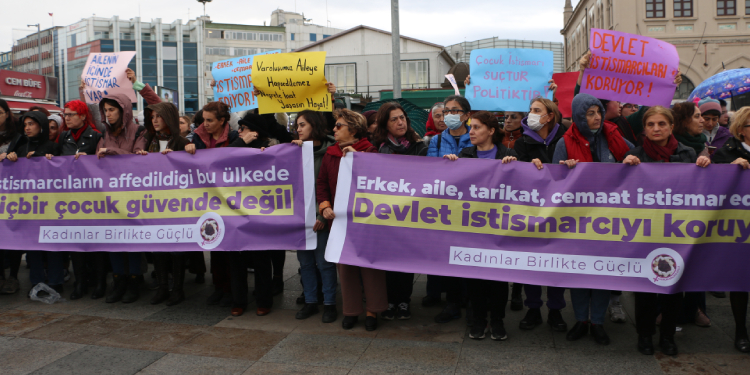 Ayrıca kadınlar “Erkek, aile, tarikat, cemaat istismar ediyor”, “Devlet istismarcıları koruyor”, Varoluşumuz aileye hapsedilemez. Nefrete inat yaşasın hayat”, “Kutsal aile suç mahali”, “”İstismarın rızası olmaz”, “Çocuk istismarı suçtur, politiktir!”, “Erkek-devlet şiddetine son”, “Ailenin içinde istismar var”, “Kutsal aile bir yalan”, “Erkek yargı hesap verecek”, “Koruma AKlama yargıla”, “Aileniz batsın kadınlar yaşasın”, “Failleri koruyanlar hesap verecek”, “İstismar suçtur failleri yargıla”, “Çocuk istismarına karşı adalet biziz, susmayacağız!”, “Karanlığın kör kuyusu tarikatlar kapatılsın”, “Faillerden hesabı kadınlar soracak” dövizleri taşıdı.
