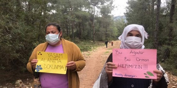 Kadınlar, İkizköy’de maden sahası için çam ağaçlarının kesimine izin vermeyerek, “Orman kıyımına izin vermeyeceğiz” dedi.