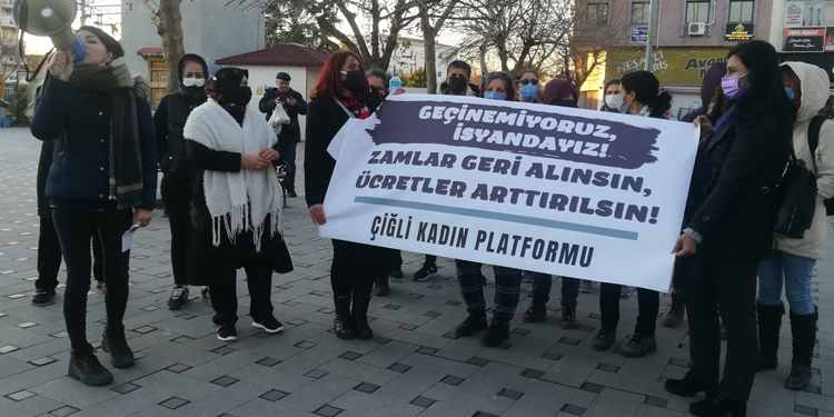 İzmir’de Çiğli Kadın Platformu, döviz kuru ve enflasyondaki artışla birlikte art arda gelen zamlara ilişkin “Zamlar geri alınsın, ücretler arttırılsın” şiarıyla Çiğli Kasaplar Meydanı’nda basın açıklaması yaptı. “Geçinemiyoruz, isyandayız. Zamlar geri alınsın, ücretler arttırılsın” pankartı açıklamada basın metnini Nebahat Çelik okudu.