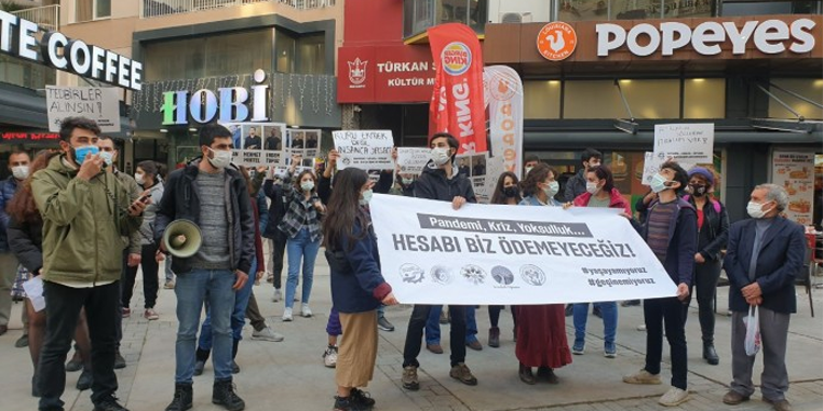 Kafe ve Bar Çalışanları Dayanışması, Turizm İşçileri Dayanışması, Otel ve Turizm İşçileri Sendikası ve Kent Emekçileri Dayanışması salgın nedeniyle kapatılan iş yerleri ve zararların karşılanması için basın açıklaması yaptı. Alsancak Türkan Saylan Kültür Merkezi önünde açıklama yapan emekçiler “Pandemi, kriz, yoksulluk. Hesabı biz ödemeyeceğiz” pankartı açarak sık sık “İnsanca yaşamak istiyoruz” sloganları attı.