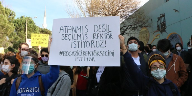 Boğaziçi Üniversitesi öğrencileri, üniversitelerine atanan “kayyım rektör” Melih Bulu’yu protesto etmek amacıyla başlatmış olduğu eylem 10’uncu gününde. Eylemlerini kampüs içerisinde açtıkları çadırlara taşıyan öğrenciler, rektörlük binasının da bulunduğu Güney Kampüsü’nde basın açıklaması gerçekleştirdi. Çok sayıda öğrencinin katıldığı açıklamada, sık sık “Üniversiteler bizimdir, bizimle özgürleşecek” ve “Yaşasın öğrenci dayanışması” sloganları atıldı.