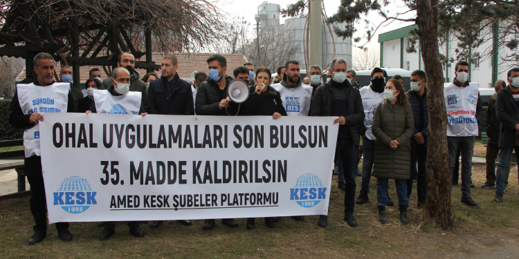 Kamu Emekçileri Sendikaları Konfederasyonu (KESK) Amed Şubeler Platformu, OHAL uygulamalarının kaldırılması talebiyle Ofis semtinde bulunan Hazal Park’ta açıklama yaptı. Çok sayıda sendika üyesinin katıldığı açıklamada, “OHAL uygulamaları son bulsun. 35’inci madde kaldırılsın” yazılı pankartı taşındı. Sendika üyeleri, sık sık “Hak, hukuk, adalet direnerek gelecek”, “Direne direne kazanacağız” ve “AKP halka hesap verecek” sloganları attı.