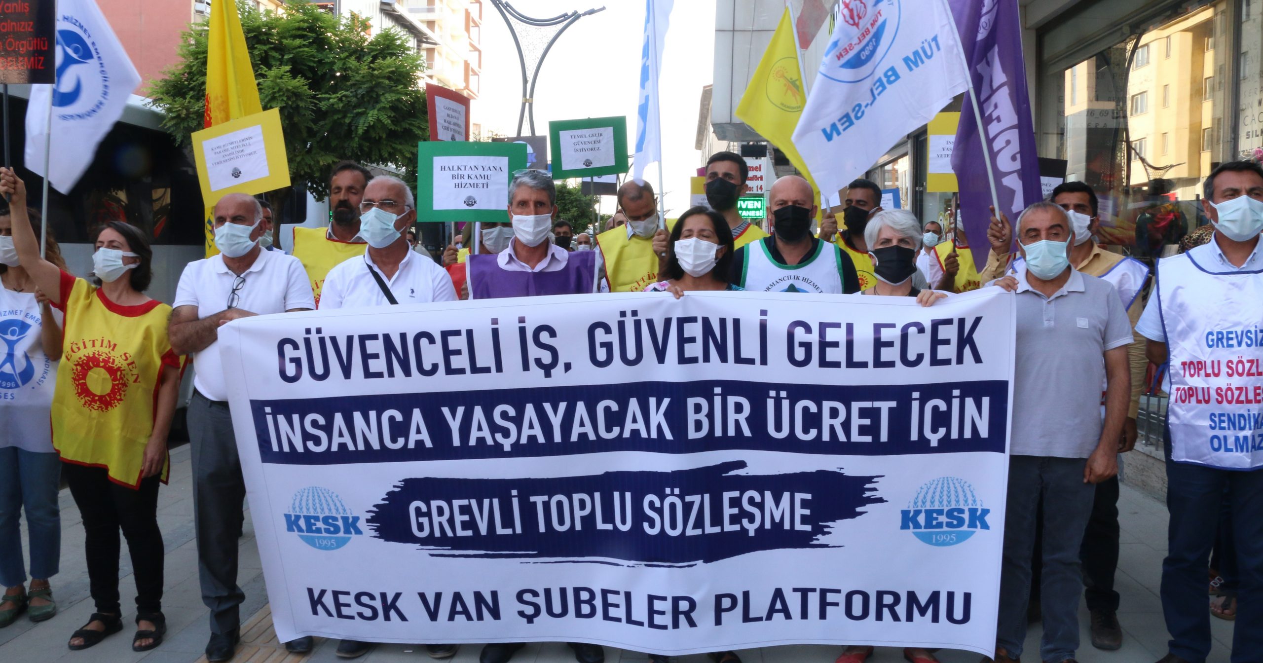 Kamu Emekçileri Sendikaları Konfederasyonu (KESK) Van Şubesi ve Merkez Yönetim Kurulu Üyeleri Cumhuriyet Caddesi’nde, Toplu İş Sözleşmesi (TİS) kapsamında açıklama yaparak taleplerini sıraladı. Açıklamaya KESK MYK üyesi Döne Gevher Koyun, Eğitim-Sen MYK Üyesi Ramazan Gürbüz, SES MYK Üyesi Gönül Adıbelli, Tümbel-Sen MYK Üyesi Yılmaz Yıldırımcı, Tarım Orkan-Sen MYK Üyesi Ahmet Keleş, BTS MYK Üyesi Nazım Sarıyılmaz ve KESK Van Şube Başkan ve üyeleri katıldı.
