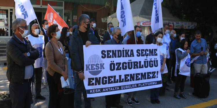 Kamu Emekçileri Sendikaları Konfederasyonu (KESK) Antalya Şubeler Platformu, “Sendika seçme özgürlüğü engellenemez” talebiyle Atatürk Devlet Hastanesi’nde açıklama yaptı. Açıklamada, “Baskılar bizi yıldıramaz”, “Birleşe birleşe kazanacağız” ve “Sendikal tercih engellenemez” sloganları atıldı.
