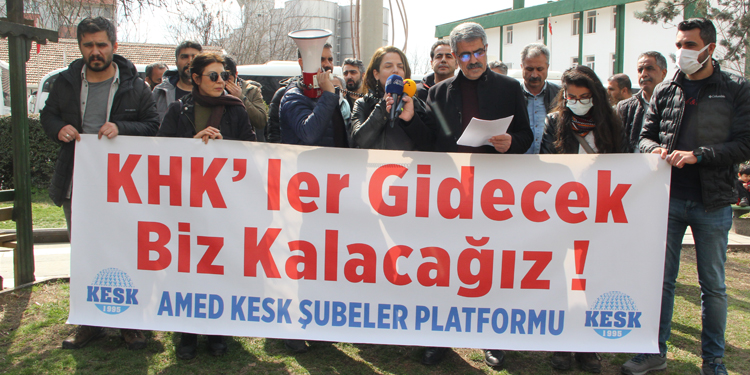 Kamu Emekçileri Sendikaları Konfederasyonu (KESK) Amed Şubeler Platformu, yaptıkları açıklama ile kamuda yapılan ihraçlara gerekçe olarak gösterilen 375 sayılı Kanun Hükmünde Kararnameye (KHK) eklenen geçici 35’inci Madde’ye dönük tepkilerini göstermeye devam etti. Ofis semtindeki Hazal Park’ta toplanan KESK’liler, “KHK’lar gidecek bir kalacağı” pankartı taşıdı. Açıklamayı Yapı Yol Sendikası Şube Başkanı Sidar Çelik okudu.