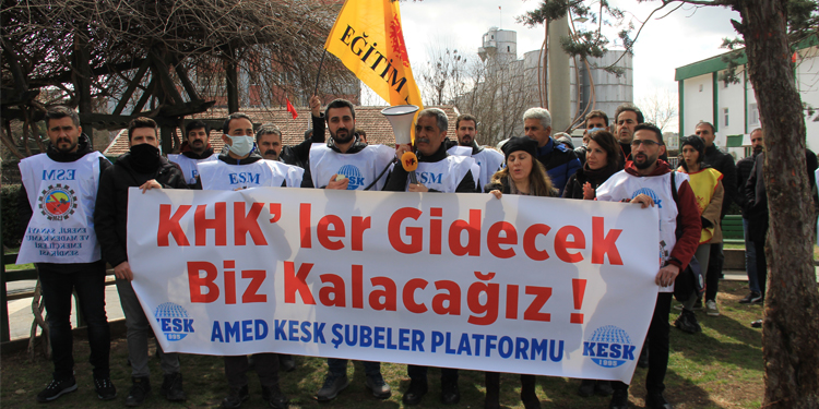 Kamu Emekçileri Sendikaları Konfederasyonu (KESK) Amed Şubeler Platformu, kamuda yapılan ihraçlara gerekçe yapılan 375 sayılı KHK’ye eklenen geçici 35’inci Madde’nin kaldırılmasına dönük eylemlerini sürdürdü. Bir kez daha Ofis semtindeki Hazal Park’ta toplandı. “KHK’ler gidecek, biz kalacağız” pankartı taşıyan platform bileşenleri adına Enerji, Sanayi ve Maden Kamu Emekçileri Sendikası (ESM) Şube Sekreteri Serdar Keskin konuştu.