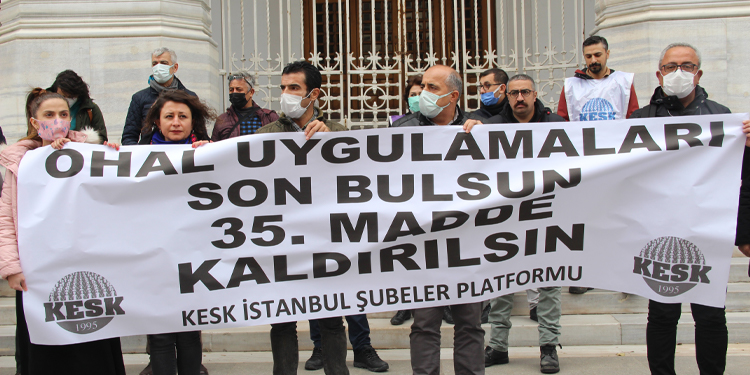 Kamu Emekçileri Sendikaları Konfederasyonu (KESK) İstanbul Şubeler Platformu, Diyarbakır’da 21 öğretmenin ihraç edilmesine ilişkin Sirkeci’de bulunan PTT Baş Müdürlüğü önünde açıklama yaptı. Açıklamada, “OHAL uygulamaları son bulsun 35’inci madde kaldırılsın” pankartı açıldı.