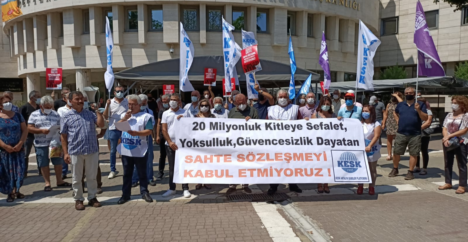 Kamu Emekçileri Sendikaları Konfederasyonu (KESK) Antalya Şubeler Platformu, hükümet ve Memur-Sen arasındaki toplu sözleşme görüşmelerinde varılan mutabakata ve açıklanan zam oranlarına düzenlediği açıklamayla tepki gösterdi. Antalya Defterdarlığı önünde yapılan açıklamada, “20 milyonluk kitleye sefalet, yoksulluk, güvencesizlik dayatan sözleşmeyi kabul etmiyoruz” pankartı açıldı. Halkların Demokratik Partisi (HDP) Antalya Milletvekilli Kemal Bülbül’ünde katıldığı açıklamada konuşan Dönem Sözcüsü Nurettin Sönmez, kapalı kapılar ardında yapılan görüşmeler sonucunda imzalanan TİS mutabakatını “ölümü gösterip sıtmaya razı etmek” olarak nitelendirdi.