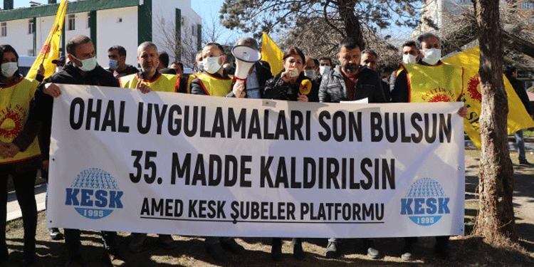 Olağanüstü Hal (OHAL) uygulamalarını devam ettiren geçici 35’inci maddenin kaldırılması isteyen KESK Amed Şubeler Platformu, eylemlerinin 14’üncü haftasında Ofis semtindeki Hazal Park’ta toplandı. Platform adına yapılan açıklamayı bu hafta Eğitim ve Bilim Emekçileri Sendikası (Eğitim Sen) 2 Nolu Şube Eşbaşkanı Hasan Çıkrıt okudu.