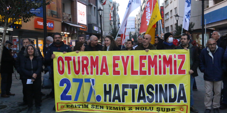 Eğitim ve Bilim Emekçileri Sendikası (Eğitim Sen) İzmir 2 Nolu Şubesi’nin, Kanun Hükmünde Kararname (KHK) ile ihraç edilen kamu emekçilerinin işlerine iadesi için düzenlediği oturma eylemi 277’nci haftasında devam etti. Karşıyaka İskelesi karşısında yapılan eylemde sık sık, “Asla yalnız yürümeyeceksin” “Direne direne kazanacağız” sloganları atıldı. Basın açıklamasına siyasi parti temsilcileri, sivil toplum kuruluşları temsilcileri katılarak destek verdi.
