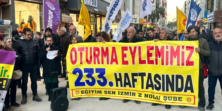Eğitim ve Bilim Emekçileri Sendikası (Eğitim Sen) İzmir 2 Nolu Şubesi’nin Kanun Hükmünde Kararname (KHK) ile ihraç edilen kamu emekçileri için başlattıkları oturma eyleminin 233’üncüsünü Karşıyaka İskelesi karşısında gerçekleştirdi. “İhraç tecrittir. Tecrit insan hakkı ihlalidir. Hak ihlallerine hayır. İşimize geri döneceğiz” pankartının açıldığı açıklamada sık sık “Hak, hukuk, adalet” ve “Gün gelecek devran dönecek AKP halka hesap verecek” sloganları atıldı.