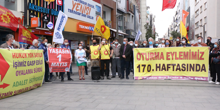 Eğitim Sen İzmir 2 No’lu Şube tarafından Kanun Hükmünde Kararname (KHK) ile ihraç edilenlerin işlerine iadesi için düzenledikleri oturma eylemi 170’inci haftasında devam etti. Karşıyaka İskele önünde gerçekleşen eyleme Halkların Demokratik Partisi (HDP) milletvekili Murat Çepni, HDP İzmir İl Eşbaşkanı Kadir Badur, Hakların Demokratik Kongresi (HDK) İzmir İl Eşsözcüsü Mehmet Sabri Gül, DİSK il temsilcileri de destek verdi. “Oturma Eylemimiz 170’inci Haftasında” pankartı açıldığını eylemde sık sık “Karanlığa teslim olmayacağız , “İş aş özgürlük” ve “Yaşasın 1 Mayıs alandayız” sloganları atıldı.