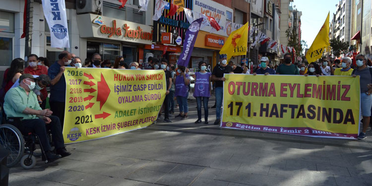 Eğitim Sen İzmir 2 No’lu Şube Kanun Hükmünde Kararname (KHK) ile ihraç edilenlerin işlerine iadesi için düzenledikleri oturma eylemi 171’inci haftasında devam etti. Karşıyaka İskelesi önünde düzenlenen eylemde sık sık “Zafer direnen emekçinin olacak”, “Katillerden hesabı emekçiler soracak” sloganları atıldı.