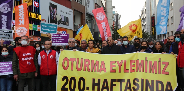 Eğitim ve Bilim Emekçileri Sendikası (Eğitim Sen) İzmir Şubesi, Kanun Hükmünde Kararname (KHK) ile ihraç edilen kamu emekçilerinin işlerine geri dönmesi için başlattıkları oturma eylemi 200’üncü haftasında devam ediyor. Bu haftaki oturma eylemine Halkların Demokratik Partisi (HDP), Halkların Demokratik Kongesi (HDK) il eşbaşkanları, Kamu Emekçileri Kamu Emekçileri Sendikaları Konfederasyonu (KESK) Eş Genel Başkanı Mehmet Bozgeyik ve siyasi parti temsilcileri katıldı. “Oturma eylemimiz 200. Haftasında”, “İhraç tecrittir. Tecrit insan hakları ihlalidir. Hak ihlallerine hayır. İşimize geri döneceğiz” pankartları taşınırken, “Karanlığa teslim olmayacağız”, “KHK’nız batsın, öğretmenler yaşasın”, “Dünyayı yerinden oynatacağız” dövizleri taşındı. Açıklamada sık sık “Direne direne kazanacağız”, “Zam, zulüm işkence işte AKP”, “KHK’lar gidecek, biz kalacağız” sloganları atıldı.