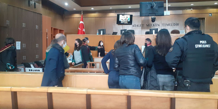 HDP milletvekilleri Hüseyin Kaçmaz, Sait Dede, Tülay Hatimoğulları, Dilan Dirayet Taşdemir ve Oya Ersoy da adliye önünde yaptıkları basın açıklamasının ardından duruşmayı izledi.