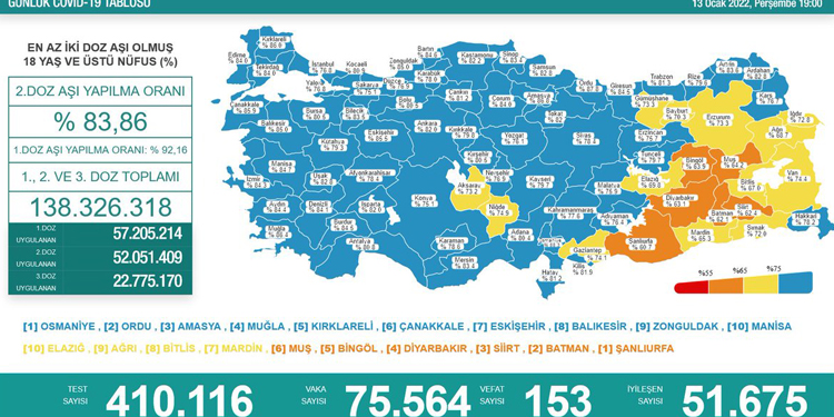 Sağlık Bakanlığı’nın günlük açıkladığı koronavirüs verilere göre son 24 saatte 410 bin 116 test yapıldı ve 75 bin 564 yeni vaka tespit edildi. 153 kişinin koronavirüs sebebiyle hayatını kaybettiği belirtildi.