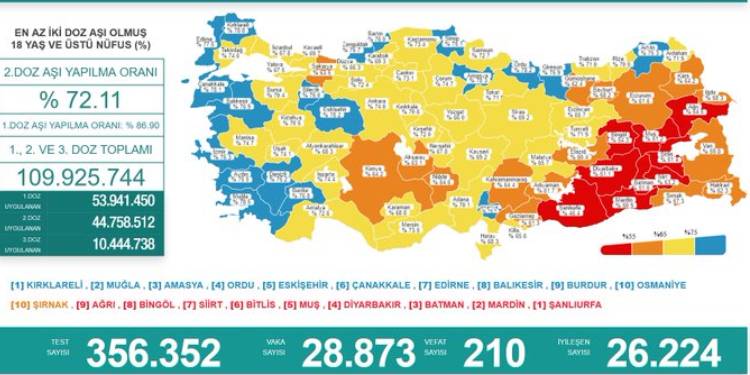 Sağlık Bakanlığı’nın günlük açıkladığı koronavirüs verilere göre son 24 saatte 356 bin 352 test yapıldı ve 28 bin 873 yeni vaka tespit edildi. 210 kişinin koronavirüs sebebiyle hayatını kaybettiği belirtildi.